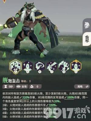 逐个对敌方英豪开火,至少发射五次炮击。这些炮击对周边一格内的敌人造成320%的伤害,对友军则造成100%伤害。若同一目标遭受两次以上炮击,后续伤害减少至20%。